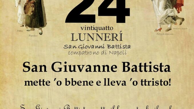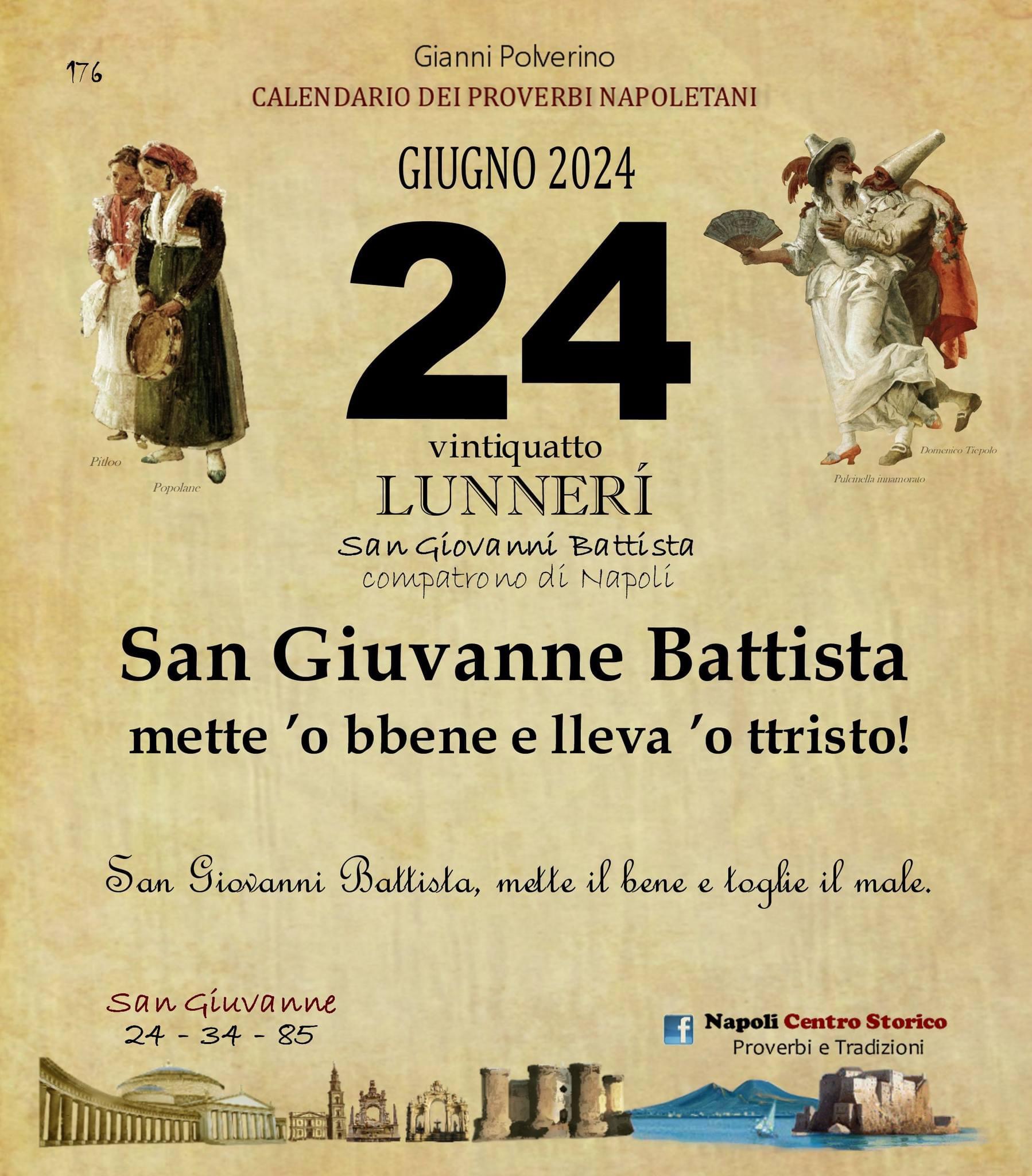 ‘O PRUVERBIO D’ ‘O JUORNO. Lunedì 24 giugno 2024 24/06/2024 binews.it EVIDENZA, Il Proverbio del Giorno 0 di Gianni Polverino San Giuvanne Battista mette ’o bbene e lleva ’o ttristo! San Giovanni Battista, mette il bene e toglie il male.
