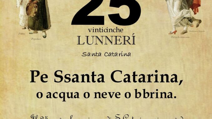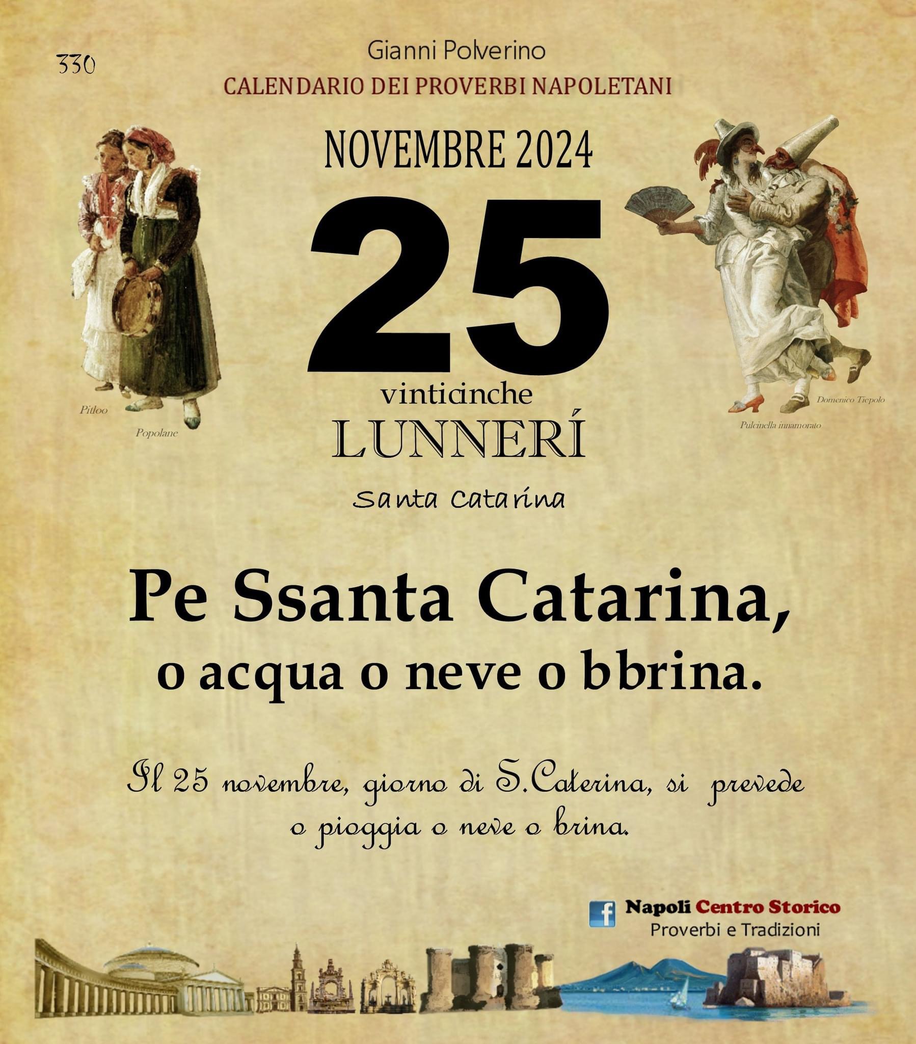 ‘O PRUVERBIO D’ ‘O JUORNO. Lunedì 25 novembre 2024 25/11/2024 binews.it EVIDENZA, Il Proverbio del Giorno 0 di Gianni Polverino Pe Ssanta Catarina, o acqua o neve o bbrina. Il 25 novembre, giorno di S.Caterina, si prevede o pioggia o neve o brina.