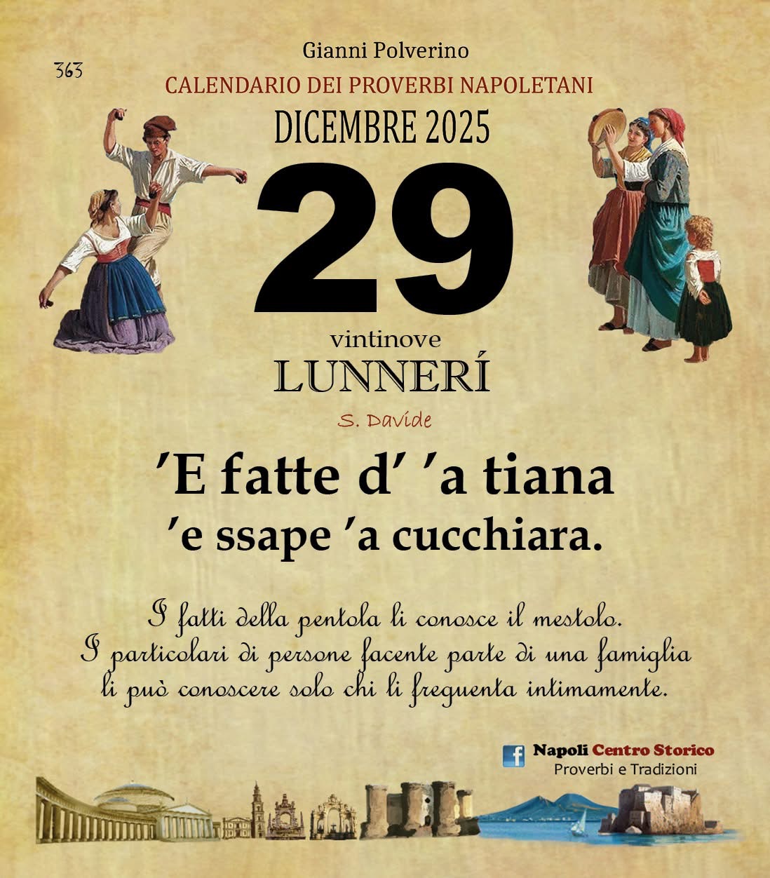 ‘O PRUVERBIO D’ ‘O JUORNO. Lunedì 29 dicembre 2025 29/12/2025 binews.it EVIDENZA, Il Proverbio del Giorno 0 di Gianni Polverino’E fatte d’ ’a tiana ’e ssape ’a cucchiara. I fatti della pentola li conosce il mestolo. I particolari di persone facente parte di una famiglia li può conoscere solo chi li freguenta intimamente.
