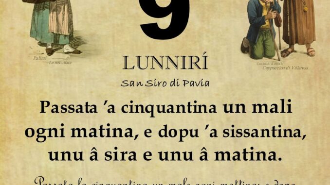 ‘O PRUVERBIO D’ ‘O JUORNO. Lunedì 9 dicembre 2024 09/12/2024 binews.it EVIDENZA, Il Proverbio del Giorno 0 di Gianni Polverino Passata ’a cinquantina un mali ogni matina, e dopu ’a sissantina, unu â sira e unu â matina. Passata la cinquantina un male ogni mattina; e dopo la sessantina, uno alla sera e uno alla mattina.