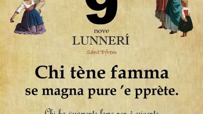 ‘O PRUVERBIO D’ ‘O JUORNO. Lunedì 9 giugno 2025 09/06/2025 binews.it EVIDENZA, Il Proverbio del Giorno 0 di Gianni Polverino Chi tène famma se magna pure ’e pprète. Chi ha veramente fame non è esigente e si accontenta di tutto.