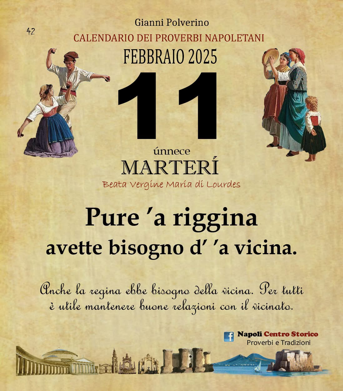 ‘O PRUVERBIO D’ ‘O JUORNO. Martedì 11 febbraio 2025 11/02/2025 binews.it EVIDENZA, Il Proverbio del Giorno 0 di Gianni Polverino Pure ’a riggina avette bisogno d’ ’a vicina. Anche la regina ebbe bisogno della vicina. Per tutti è utile mantenere buone relazioni con il vicinato.