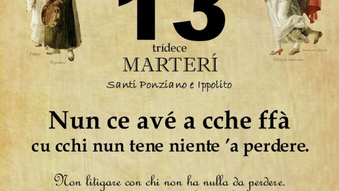 ‘O PRUVERBIO D’ ‘O JUORNO. Martedì 13 agosto 2024 13/08/2024 binews.it EVIDENZA, Il Proverbio del Giorno 0 di Gianni PolverinoNun ce avé a cche ffà cu cchi nun tene niente ’a perdere.Non litigare con chi non ha nulla da perdere. ne chiamarlo in giudizio, perché non ha comunque possibilità finanziaria di risarcirti.