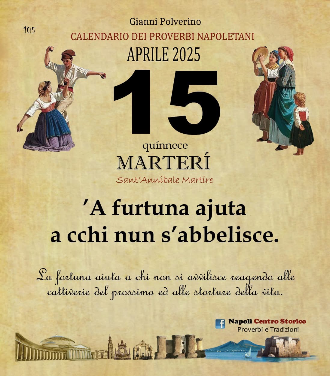 ‘O PRUVERBIO D’ ‘O JUORNO. Martedì 15 aprile 2025 15/04/2025 binews.it EVIDENZA, Il Proverbio del Giorno 0 di Gianni Polverino ’A furtuna ajuta a cchi nun s’abbelisce. La fortuna aiuta a chi non si avvilisce reagendo alle cattiverie del prossimo ed alle storture della vita.