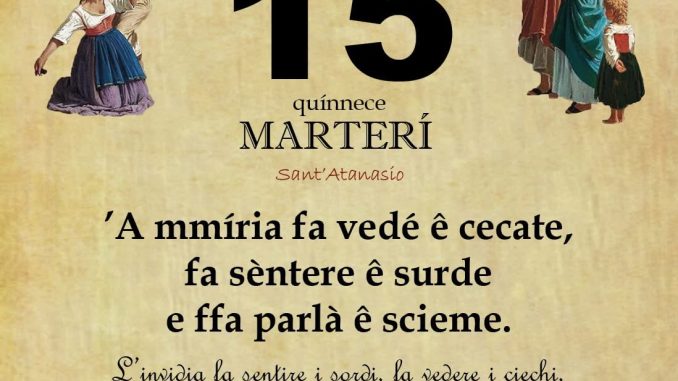 ‘O PRUVERBIO D’ ‘O JUORNO. Martedì 15 luglio 2025 15/07/2025 binews.it EVIDENZA, Il Proverbio del Giorno 0 di Gianni Polverino ’A mmíria fa vedé ê cecate, fa sèntere ê surde e ffa parlà ê scieme. L’invidia fa sentire i sordi, fa vedere i ciechi, ma soprattutto fa parlare gli stupidi.