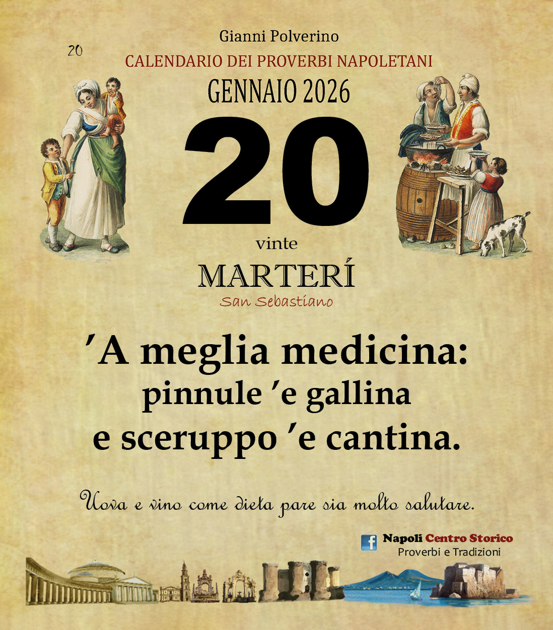 ‘O PRUVERBIO D’ ‘O JUORNO. Martedì 20 gennaio 2026 20/01/2026 binews.it EVIDENZA, Il Proverbio del Giorno 0 di Gianni Polverino’A meglia medicina: pinnule ’e gallina e sceruppo ’e cantina.Uova e vino come dieta pare sia molto salutare.