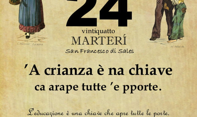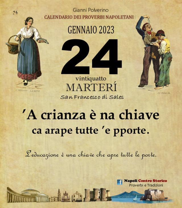 ‘O PRUVERBIO D’ ‘O JUORNO. Martedì 24 gennaio 2023 24/01/2023 binews.it EVIDENZA, Il Proverbio del Giorno 0 di Gianni Polverino ’A crianza è na chiave ca arape tutte ’e pporte. L’educazione è una chiave che apre tutte le porte.