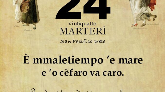 ‘O PRUVERBIO D’ ‘O JUORNO. Martedì 24 settembre 2024 24/09/2024 binews.it EVIDENZA, Il Proverbio del Giorno 0 di Gianni Polverino È mmaletiempo ’e mare e ’o cèfaro va caro. Quando nei tempi di crisi economica le cose vanno male e tutto aumenta.