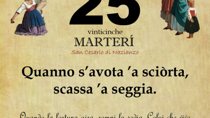 ‘O PRUVERBIO D’ ‘O JUORNO. Martedì 25 febbraio 2025 25/02/2025 binews.it EVIDENZA, Il Proverbio del Giorno 0 di Gianni PolverinoQuanno s’avota ’a sciòrta, scassa ’a seggia.Quando la fortuna gira, rompi la sedia. Colui che vive in un periodo fortunato può permettersi ciò che vuole.