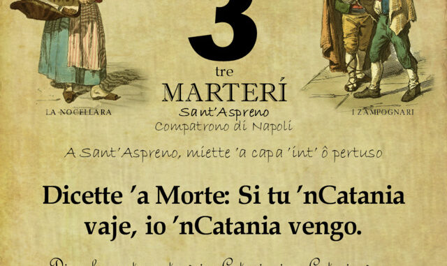 ‘O PRUVERBIO D’ ‘O JUORNO. Martedì 3 agosto 2021 03/08/2021 binews.it EVIDENZA, Il Proverbio del Giorno 0 di Gianni Polverino Dicette ’a Morte: Si tu ’nCatania vaje, io ’nCatania vengo. Disse la morte: se tu vai a Catania, io a Catania vengo. Non si può sfuggire al proprio destino.