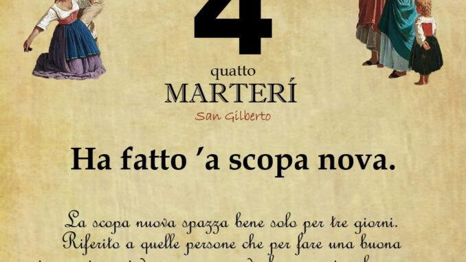 ‘O PRUVERBIO D’ ‘O JUORNO. Martedì 4 febbraio 2025 04/02/2025 binews.it EVIDENZA, Il Proverbio del Giorno 0 di Gianni Polverino Ha fatto ’a scopa nova. La scopa nuova spazza bene solo per tre giorni. Riferito a quelle persone che per fare una buona impressione si danno un gran da fare e poi col passare del tempo, rallentano la loro vivacità lavorativa.