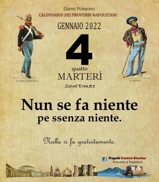 ‘O PRUVERBIO D’ ‘O JUORNO. Martedì 4 gennaio 2021 04/01/2022 binews.it EVIDENZA, Il Proverbio del Giorno 0 di Gianni Polverino Nun se fa niente pe ssenza niente. Nulla si fa gratuitamente. Po