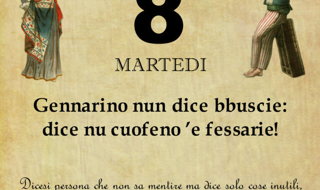 ‘O PRUVERBIO D’ ‘O JUORNO. Martedì 8 settembre 2020 08/09/2020 binews.it EVIDENZA, Il Proverbio del Giorno 0 di Gianni Polverino Gennarino nun dice bbuscie: dice nu cuofeno ’e fessarie! Dicesi persona che non sa mentire ma dice solo cose inutili, cose che contano poco. “fesserie”