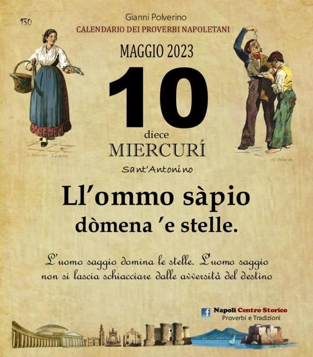 ‘O PRUVERBIO D’ ‘O JUORNO. Mercoledì 10 maggio 2023 10/05/2023 binews.it EVIDENZA, Il Proverbio del Giorno 0 di Gianni Polverino Ll’ommo sàpio dòmena ‘e stelle. L’uomo saggio domina le stelle. L’uomo saggio non si lascia schiacciare dalle avversità del destino.