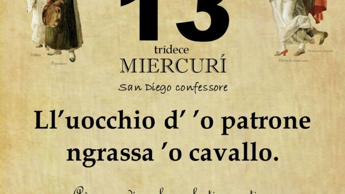 ‘O PRUVERBIO D’ ‘O JUORNO . Mercoledì 13 novembre 2024 13/11/2024 binews.it EVIDENZA, Il Proverbio del Giorno 0 di Gianni PolverinoLl’uocchio d’ ’o patrone ngrassa ’o cavallo.Aver cura di qualcosa che ti appartiene non può che comportare benefici.