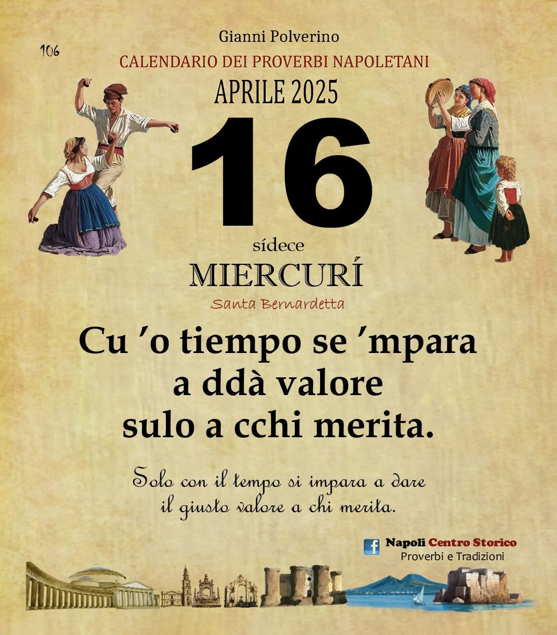 ‘O PRUVERBIO D’ ‘O JUORNO. Mercoledì 16 aprile 2025 16/04/2025 binews.it EVIDENZA, Il Proverbio del Giorno 0 di Gianni Polverino Cu ’o tiempo se ’mpara a ddà valore sulo a cchi merita. Solo con il tempo si impara a dare il giusto valore a chi merita.