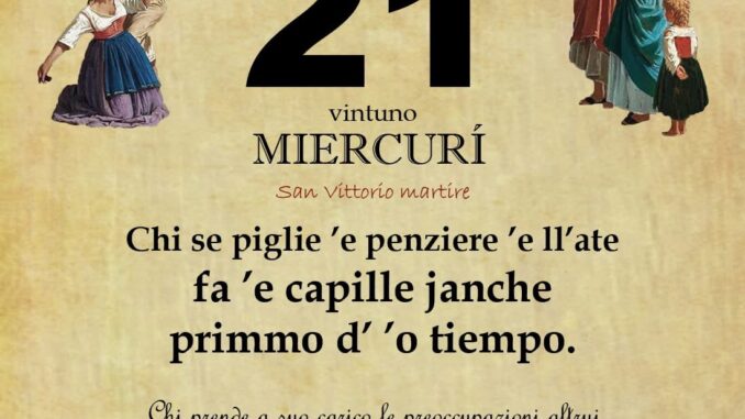 ‘O PRUVERBIO D’ ‘O JUORNO. Mercoledì 21 maggio 2025 21/05/2025 binews.it EVIDENZA, Il Proverbio del Giorno 0 di Gianni Polverino Chi se piglie ’e penziere ’e ll’ate fa ’e capille janche primmo d’ ’o tiempo. Chi prende a suo carico le preoccupazioni altrui invecchia prima del tempo.
