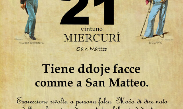 ‘O PRUVERBIO D’ ‘O JUORNO. Mercoledì 21 settembre 2022 21/09/2022 binews.it EVIDENZA, Il Proverbio del Giorno 0 di Gianni PolverinoTiene ddoje facce comme a San Matteo.Espressione rivolta a persona falsa. Modo di dire nato dalla realizzazione di una statua bifronte dedicata a San Matteo, patrono di Salerno, ubicata nel duomo.