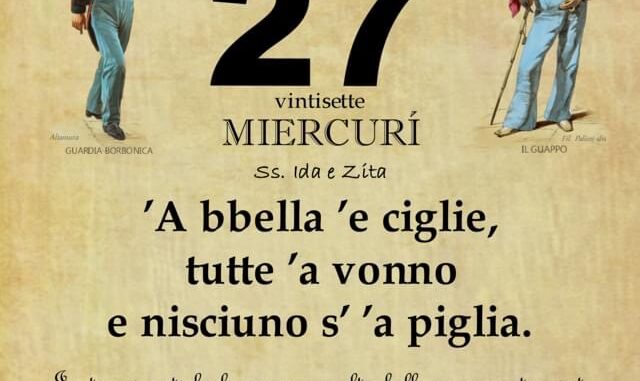 ‘O PRUVERBIO D’ ‘O JUORNO. Mercoledì 27 aprile 2022 27/04/2022 binews.it EVIDENZA, Il Proverbio del Giorno 0 di Gianni Polverino ’A bbella ’e ciglie, tutte ’a vonno e nisciuno s’ ’a piglia. In tempi antichi le ragazze molto belle erano corteggiate da tutti ma nessuno pensava di sposarle.