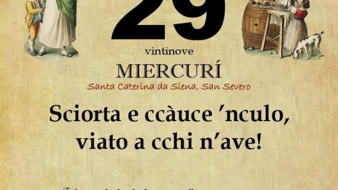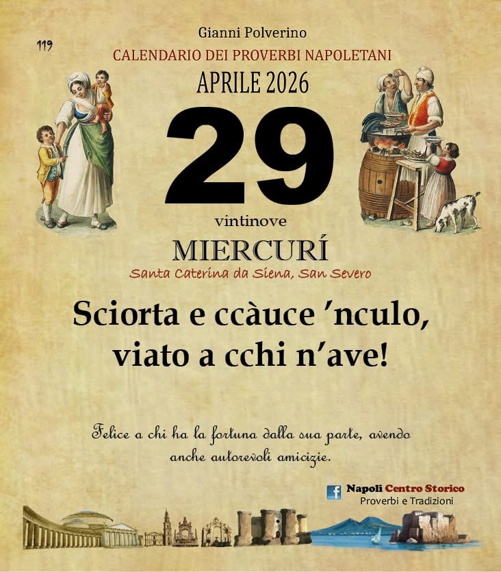 ‘O PRUVERBIO D’ ‘O JUORNO. Mercoledì 29 aprile 2026 29/04/2026 binews.it EVIDENZA, Il Proverbio del Giorno 0 di Gianni Polverino Sciorta e ccàuce ’nculo, viato a cchi n’ave! Felice a chi ha la fortuna dalla sua parte, avendo anche autorevoli amicizie.