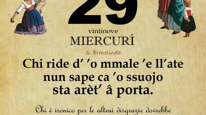 ‘O PRUVERBIO D’ ‘O JUORNO. Mercoledì 29 ottobre 2025 29/10/2025 binews.it EVIDENZA, Il Proverbio del Giorno 0 di Gianni PolverinoChi ride d’ ’o mmale ’e ll’ate nun sape ca ’o ssuojo sta arèt’ â porta. Chi è ironico per le altrui disgrazie dovrebbe sapere che le sciagure potrebbero colpire prima o poi anche lui.