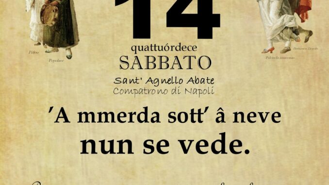 ‘O PRUVERBIO D’ ‘O JUORNO. Sabato 14 dicembre 2024 14/12/2024 binews.it EVIDENZA, Il Proverbio del Giorno 0 di Gianni Polverino’A mmerda sott’ â neve nun se vede.Bisogna essere prevenuti con tutti perchè molti riescono ad occultare bene la loro vera natura.