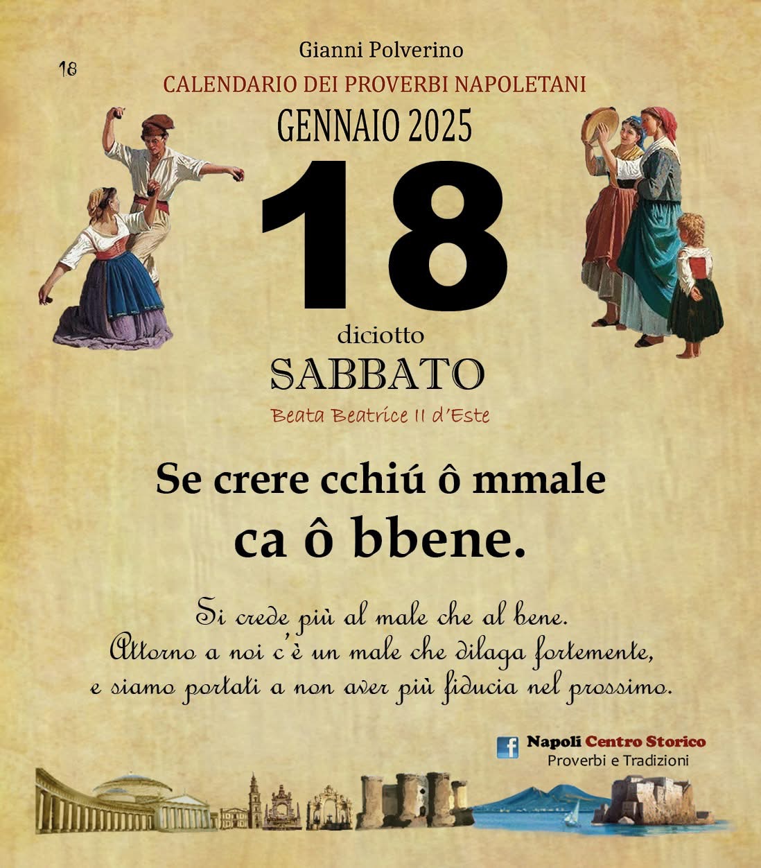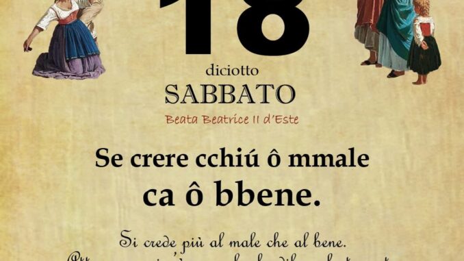 ‘O PRUVERBIO D’ ‘O JUORNO. Sabato 18 gennaio 2025 18/01/2025 binews.it EVIDENZA, Il Proverbio del Giorno 0 di Gianni Polverino Se crere cchiú ô mmale ca ô bbene. Si crede più al male che al bene. Attorno a noi c’è un male che dilaga fortemente, e siamo portati a non aver più fiducia nel prossimo.