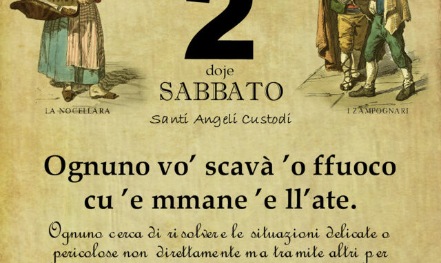 ‘O PRUVERBIO D’ ‘O JUORNO. Sabato 2 ottobre 2021 02/10/2021 binews.it EVIDENZA, Il Proverbio del Giorno 0 di Gianni Polverino Ognuno vo’ scavà ’o ffuoco cu ’e mmane ’e ll’ate. Ognuno cerca di risolvere le situazioni delicate o pericolose non direttamente ma tramite altri per non esporsi in prima persona.