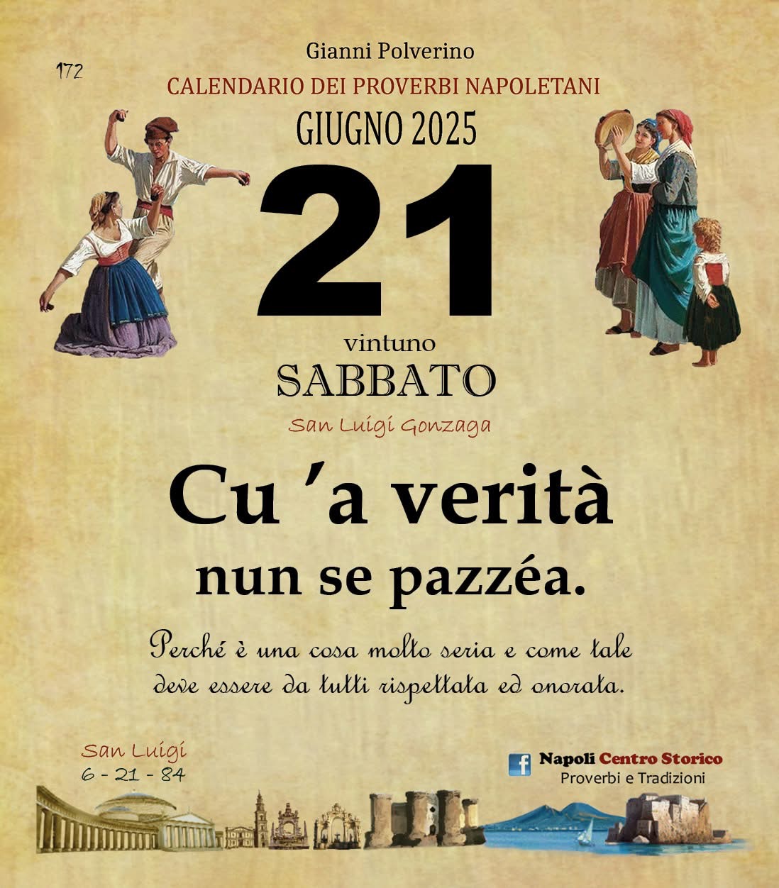 ‘O PRUVERBIO D’ ‘O JUORNO. Sabato 21 giugno 2025 21/06/2025 binews.it EVIDENZA, Il Proverbio del Giorno 0 di Gianni Polverino Cu ’a verità nun se pazzéa. Perché è una cosa molto seria e come tale deve essere da tutti rispettata ed onorata.
