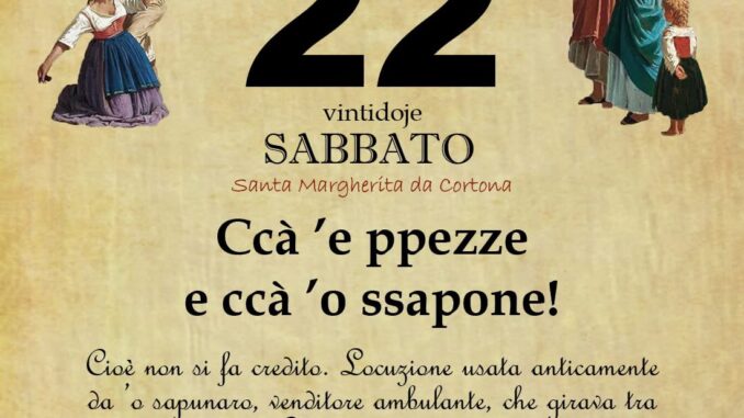 ‘O PRUVERBIO D’ ‘O JUORNO. Sabato 22 febbraio 2025 22/02/2025 binews.it EVIDENZA, Il Proverbio del Giorno 0 di Gianni Polverino Ccà ’e ppezze e ccà ’o ssapone. Cioè non si fa credito. Locuzione usata anticamente da ’o sapunaro, venditore ambulante, che girava tra i vicoli di Napoli barattando sapone in cambio di abiti usati.
