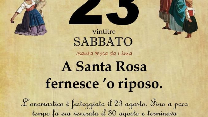 ‘O PRUVERBIO D’ ‘O JUORNO. Sabato 23 agosto 2025 23/08/2025 binews.it EVIDENZA, Il Proverbio del Giorno 0 di Gianni PolverinoA Santa Rosa fernesce ’o riposo. L’onomastico è festeggiato il 23 agosto. Fino a poco tempo fa era venerata il 30 agosto e terminava anche il riposo delle vacanze.