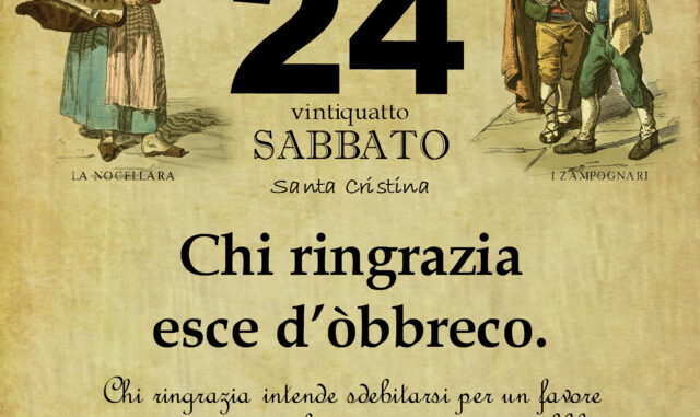 ‘O PRUVERBIO D’ ‘O JUORNO. Sabato 24 luglio 2021 24/07/2021 binews.it EVIDENZA, Il Proverbio del Giorno 0 di Gianni Polverino Chi ringrazia esce d’òbbreco. Chi ringrazia intende sdebitarsi per un favore ricevuto e di non voler mantenere nessun obbligo di riconoscenza verso chi lo ha favorito.