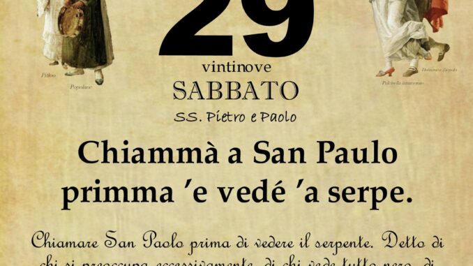 ‘O PRUVERBIO D’ ‘O JUORNO. Sabato 29 giugno 2024 29/06/2024 binews.it EVIDENZA, Il Proverbio del Giorno 0 di Gianni PolverinoChiammà a San Paulo primma ’e vedé ’a serpe.Chiamare San Paolo prima di vedere il serpente. Detto di chi si preoccupa eccessivamente, di chi vede tutto nero, di chi si affretta a fare scenari catastrofici su problemi banale,