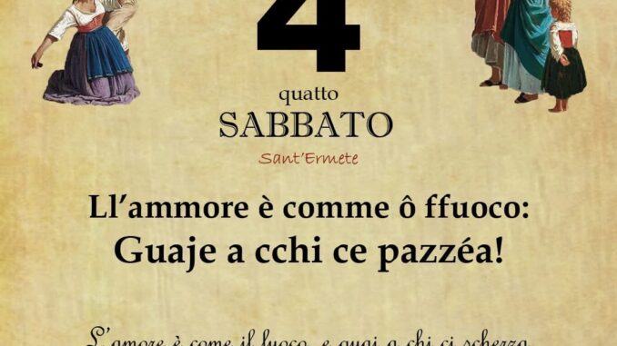 ‘O PRUVERBIO D’ ‘O JUORNO. Sabato 4 gennaio 2025 04/01/2025 binews.it EVIDENZA, Il Proverbio del Giorno 0 di Gianni Polverino Ll’ammore è comme ô ffuoco: Guaje a cchi ce pazzéa! L’amore è come il fuoco, e guai a chi ci scherza.