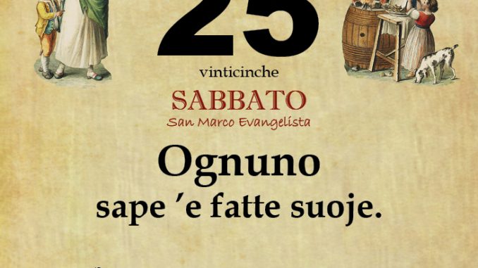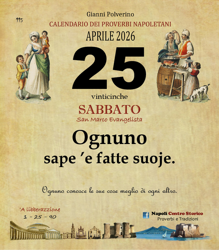 O PRUVERBIO D’ ‘O JUORNO. Sabato25 aprile 2026 25/04/2026 binews.it EVIDENZA, Il Proverbio del Giorno 0 di Gianni PolverinoOgnuno sape ’e fatte suoje.Ognuno conosce le sue cose meglio di ogni altro.