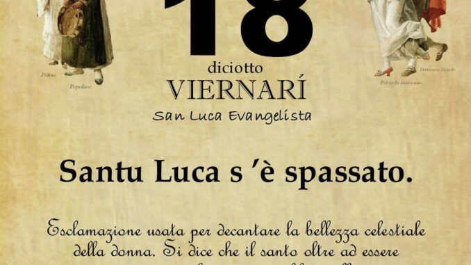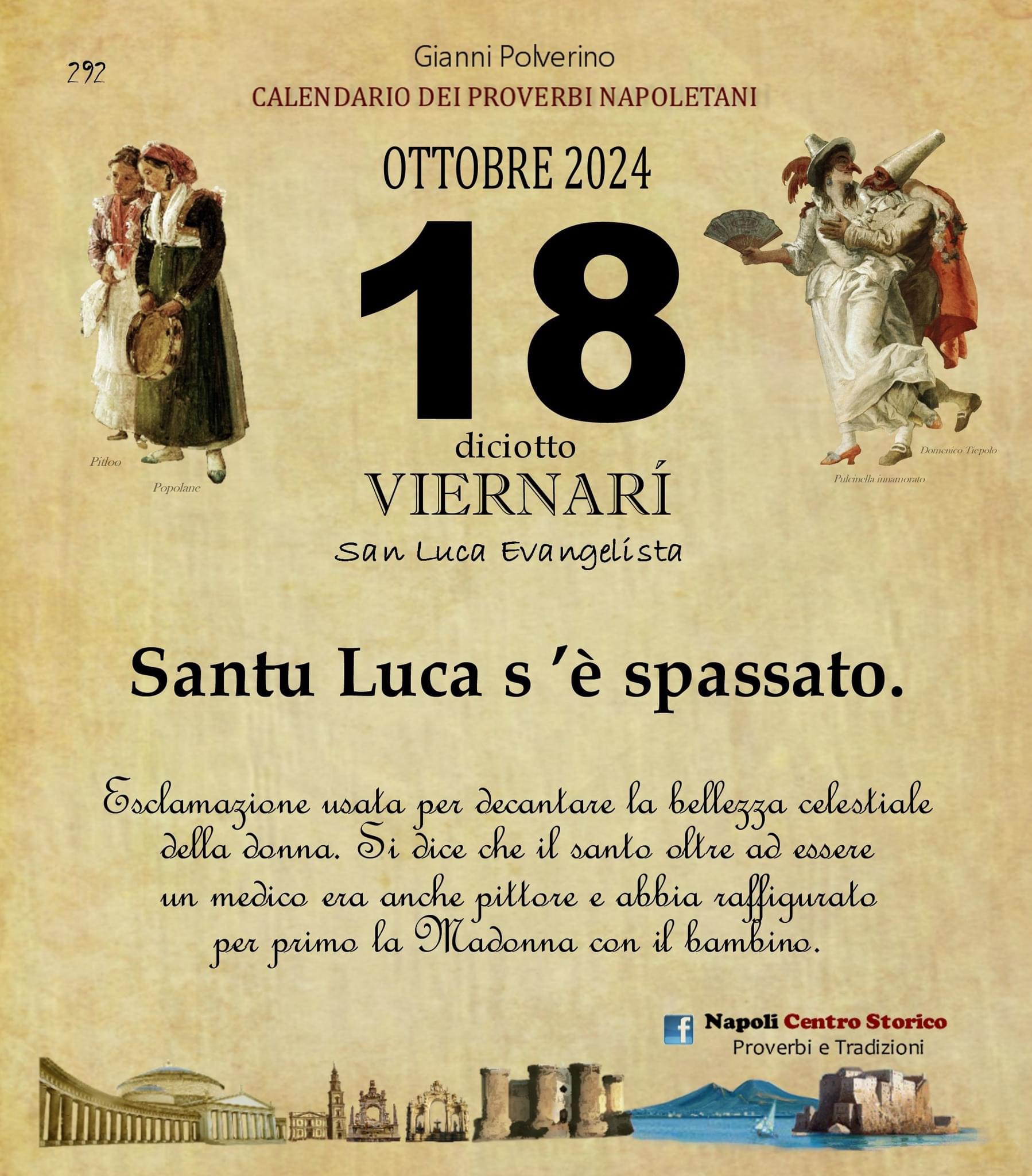 ‘O PRUVERBIO D’ ‘O JUORNO. Venerdì 18 ottobre 2024 18/10/2024 binews.it EVIDENZA, Il Proverbio del Giorno 0 di Gianni Polverino Santu Luca s ’è spassato. Esclamazione usata per decantare la bellezza celestiale della donna. Si dice che il santo oltre ad essere un medico era anche pittore e abbia raffigurato per primo la Madonna con il bambino.