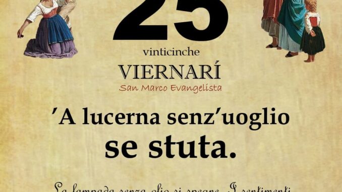 ‘O PRUVERBIO D’ ‘O JUORNO. Venerdì 25 aprile 2025 25/04/2025 binews.it EVIDENZA, Il Proverbio del Giorno 0 di Gianni Polverino ‘A lucerna senz’uoglio se stuta. La lampada senza olio si spegne. I sentimenti debbono essere costantemente alimentati.