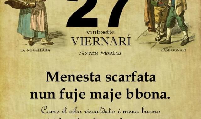 ‘O PRUVERBIO D’ ‘O JUORNO. Venerdì 27 agosto 2021 27/08/2021 binews.it EVIDENZA, Il Proverbio del Giorno 0 di Gianni Polverino Menesta scarfata nun fuje maje bbona. Come il cibo riscaldato è meno buono così è da evitare di riprendere un amore spezzato o un amicizia raffreddata.