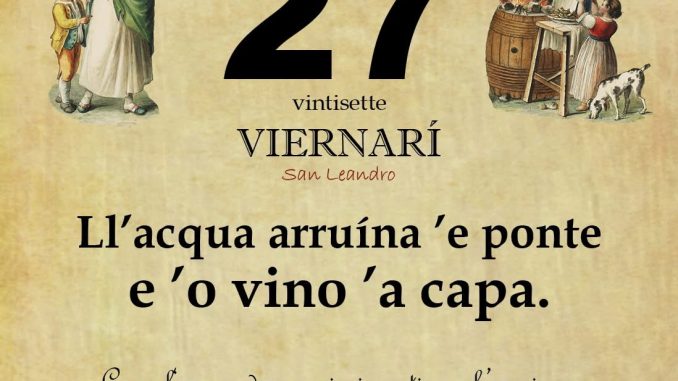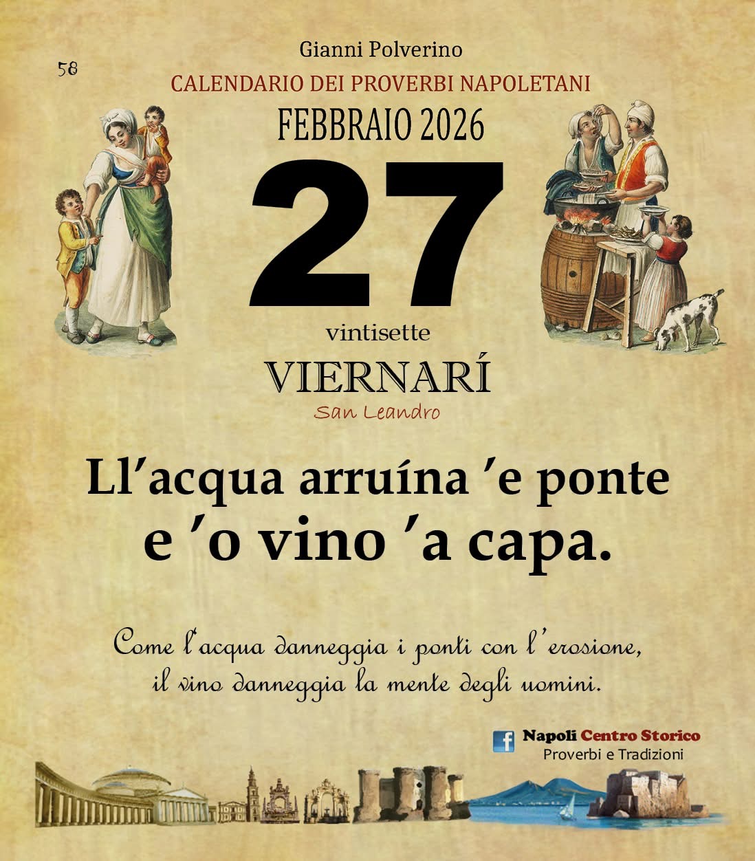 ‘O PRUVERBIO D’ ‘O JUORNO. Venerdì 27 febbraio 2026 27/02/2026 binews.it EVIDENZA, Il Proverbio del Giorno 0 di Gianni Polverino Ll’acqua arruína ’e ponte e ’o vino ’a capa. Come l‘acqua danneggia i ponti con l’erosione, il vino danneggia la mente degli uomini.
