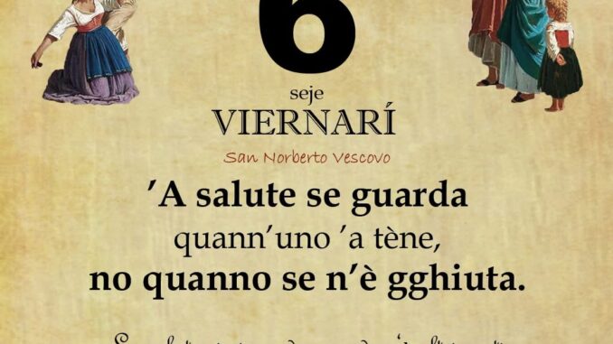 ‘O PRUVERBIO D’ ‘O JUORNO. Venerdì 6 giugno 2025 06/06/2025 binews.it EVIDENZA, Il Proverbio del Giorno 0 di Gianni Polverino ’A salute se guarda quann’uno ’a tène, no quanno se n’è gghiuta. La salute si riguarda quando c‘è altrimenti dopo sarà irreparabilmente troppo tardi.