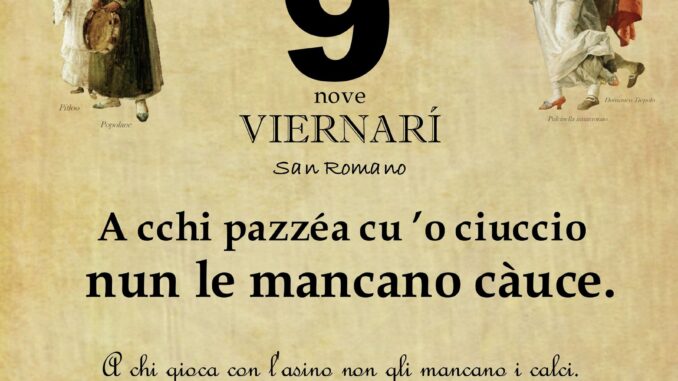 ‘O PRUVERBIO D’ ‘O JUORNO. Venerdì 9 agosto 2024 09/08/2024 binews.it EVIDENZA, Il Proverbio del Giorno 0 di Gianni PolverinoA cchi pazzéa cu ’o ciuccio nun le mancano càuce.A chi gioca con l’asino non gli mancano i calci. Chi bazzica in un brutto ambiente deve sopportarne le conseguenze.