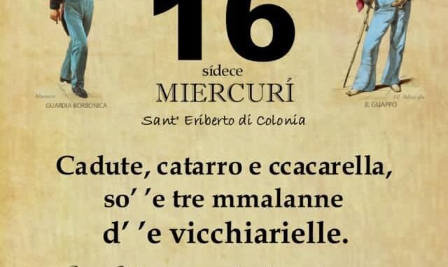 ‘O PRUVERBIO D’’O JUORNO. Mercoledì 16 marzo 2022 16/03/2022 binews.it EVIDENZA, Il Proverbio del Giorno 0 di Gianni PolverinoCadute, catarro e ccacarella, so’ ’e tre mmalanne d’ ’e vicchiarielle. Le tre C che minacciano la salute degli anziani.