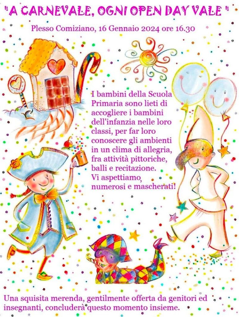 Il giorno 15 gennaio alle ore 16:30 sarà la volta del plesso IACP di Cimitile, dove le maestre e gli alunni presenteranno la scuola e le varie attività ai genitori dei bambini cinquenni; il giorno 16 gennaio alle ore 16:30 toccherà al plesso della Primaria di Comiziano dove, alunni e maestre, raccoglieranno bambini e genitori in un clima di attività all’insegna del prossimo Carnevale.