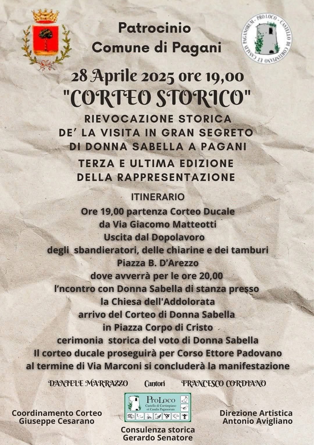 L’evento, molto atteso dalla comunità, rievoca un episodio storico legato alla figura di Donna Sabella, personaggio centrale nella storia e nelle leggende locali. La rappresentazione coinvolgerà figuranti in costume d’epoca e scenografie che ricostruiranno l’atmosfera di tempi lontani, offrendo ai cittadini e ai visitatori un viaggio suggestivo nella memoria e nelle tradizioni di Pagani.