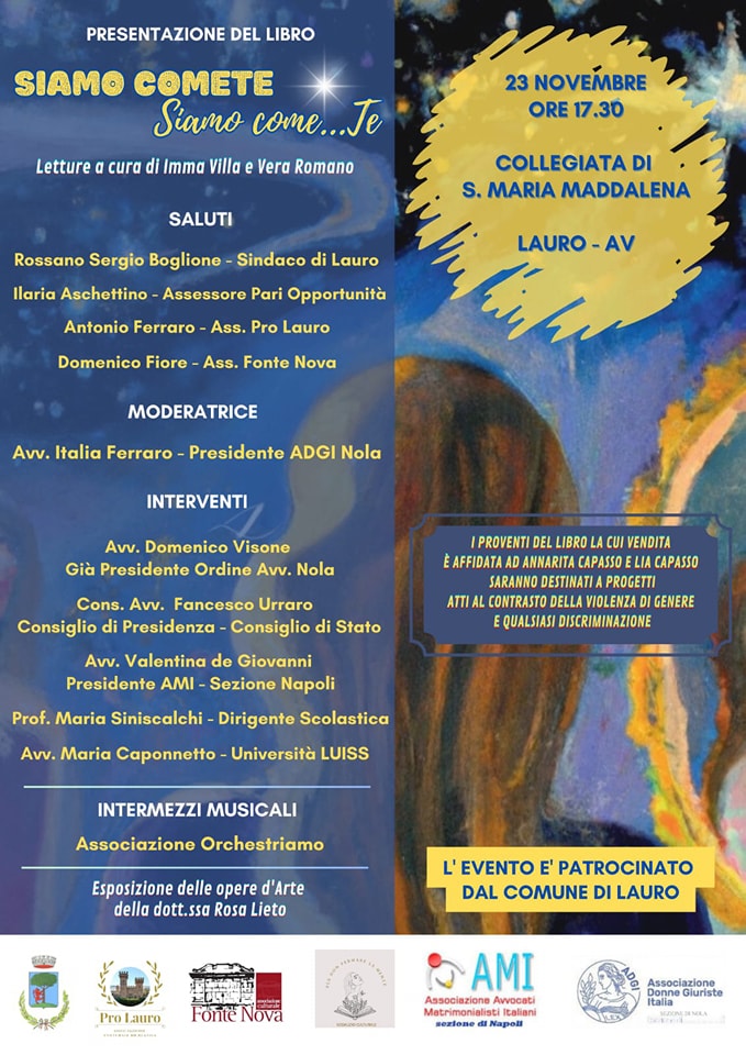 Il prossimo 23 novembre, alle ore 17:30, la suggestiva Collegiata di Santa Maria Maddalena a Lauro (AV) ospiterà un evento culturale di grande rilievo: la presentazione del libro “Siamo Comete. Siamo come…Te”. L’iniziativa, patrocinata dal Comune di Lauro, rappresenta un’importante occasione per riflettere su temi cruciali quali la lotta contro la violenza di genere e le discriminazioni.