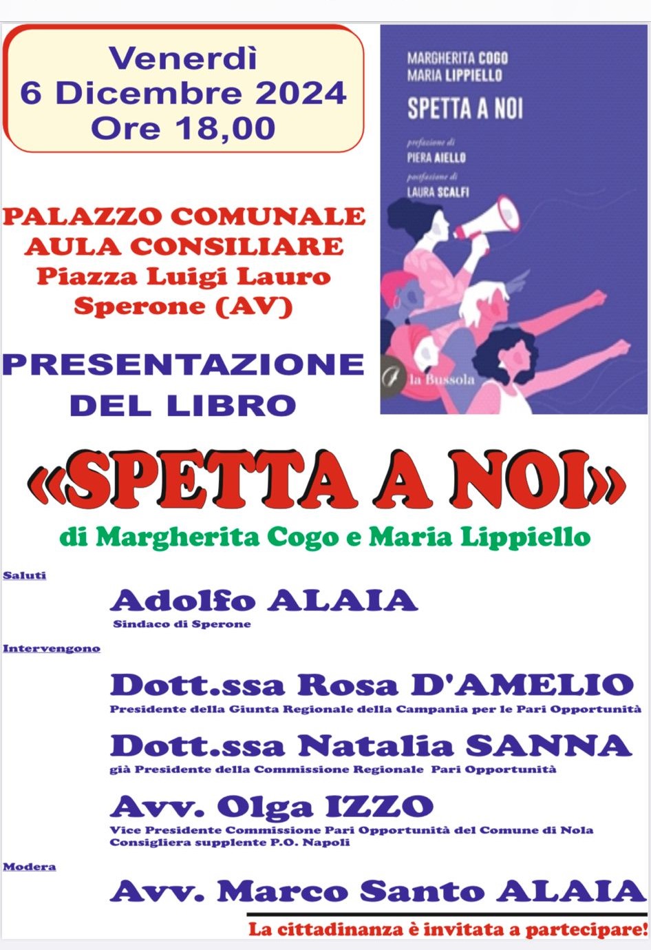 Venerdì 6 dicembre 2024, alle ore 18:00, presso l’Aula Consiliare del Palazzo Comunale di Sperone (AV), in Piazza Luigi Lauro, si terrà la presentazione del libro “Spetta a Noi”, scritto da Margherita Cogo e Maria Lippiello.