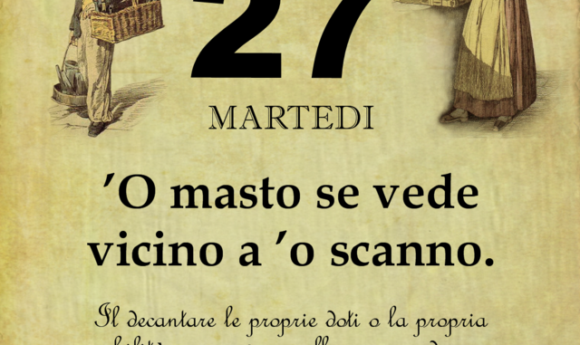 ‘O PRUVERBIO D’ ‘O JUORNO. Martedì 27 febbraio 2018 27/02/2018 binews.it EVIDENZA, Il Proverbio del Giorno 0 ’O masto se vede vicino a ’o scanno. Il decantare le proprie doti o la propria abilità non serve a nulla: occorre darne prove tangibili e concrete.