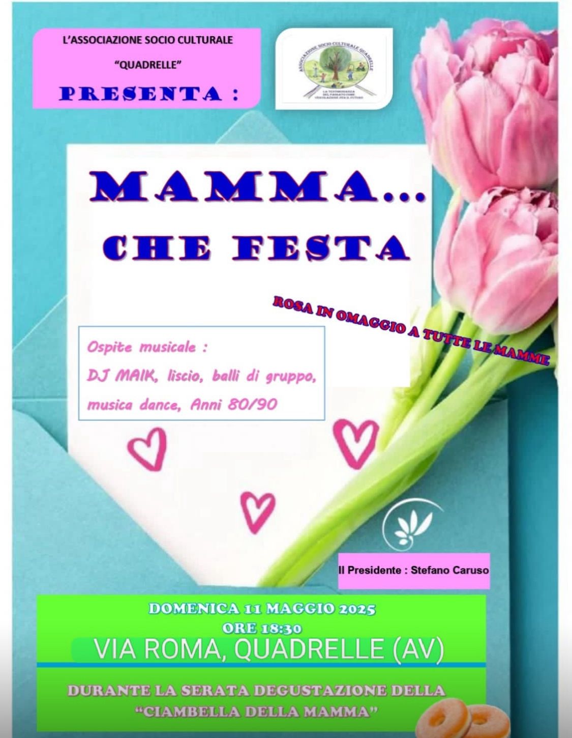 L’Associazione Socio Culturale “Quadrelle” è lieta di presentare “Mamma… che festa!”, un evento dedicato alle mamme che si terrà domenica 11 maggio 2025 alle ore 18:30 in Via Roma a Quadrelle (AV).