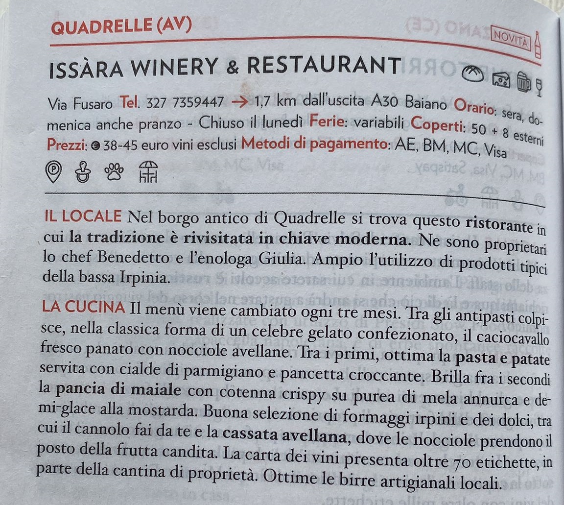 Un traguardo raggiunto grazie alla passione, alla dedizione e alla bravura dello chef Benedetto Molaro e dell’enologa Giulia La Marca. I due giovani si sono conosciuti nel 2007 frequentando il Gruppo Scout Avella I con i loro sogni nel cassetto: l’apertura di un ristorante e l’apertura di un’azienda vitivinicola . Questi sogni dopo anni di studio e sacrifici li hanno realizzati. L’azienda La Marca si trova a Parolise con un punto degustazione, invece dal 2021 nasce il progetto “Issara” che fonda le sue radici nel comprensorio avellano con la sede in Via Fusaro a Quadrelle (Av). L’inevitabile e vincente connubio “winery e restaurant” ha determinato il successo straordinario dei due giovani che hanno sostenuto da sempre che l’amore vince su tutto, è cosi è stato. Issara propone una cucina territoriale rivisitata in chiave moderna, fatta con amore, con piatti anche europei. Ogni tre mesi cambia il menù senza stravolgere più di tanto il concetto di base che presuppone l’uso dei prodotti locali come la Nocciola di Avella, il Cacio Moscio, l’Aglio Orsino del Partenio, il Pecorino di Carmasciano e Bagnolese, il Caciocavallo Irpino e il manzo irpino tenendo conto anche delle aziende agricole e i tanti produttori locali. La proposta dei menù stagionali, i prodotti e l’ampia carta dei vini, considerando la produzione delle cantine La Marca, sono stati determinanti per conquistare le pagine della guida Osteria d’Italia 2024. La Guida Osterie d’Italia è un punto di riferimento per gli amanti della buona cucina e dell’enogastronomia. È un’opera che riconosce e celebra i tesori culinari nascosti, i luoghi che portano avanti le tradizioni gastronomiche con passione e impegno. Essere inclusi in questa guida con un premio speciale per la selezione articolata e rappresentativa di vini, è un attestato di eccellenza.