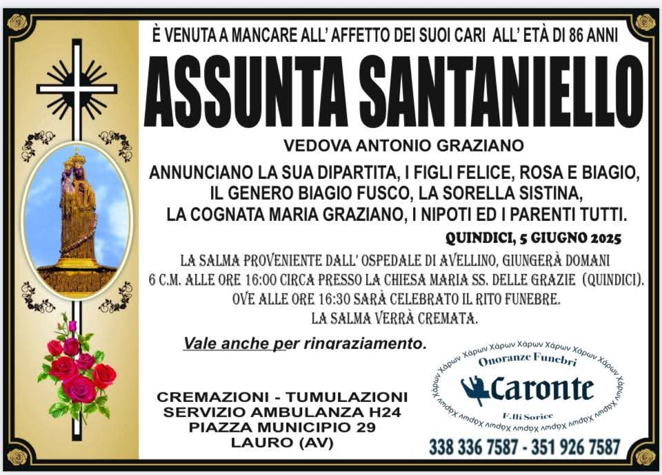 La donna, di 86 anni, è deceduta due giorni fa presso l’ospedale Moscati di Avellino. In un primo momento, come annunciato anche attraverso i manifesti funebri affissi nel territorio del Vallo di Lauro, le esequie avrebbero dovuto svolgersi nel pomeriggio di oggi in forma pubblica.